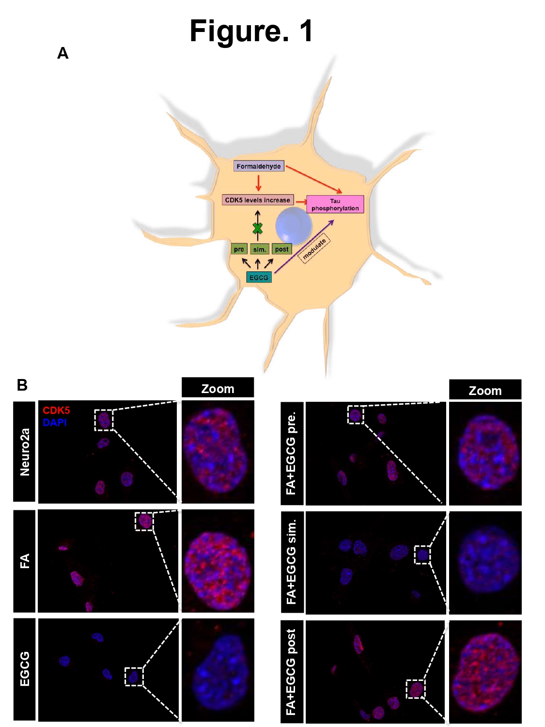 Formaldehyde, Glycerol, and paraformaldehyde were purchased from MP Biomedicals. EGCG was purchased from Sigma-Aldrich. All the cell culture reagents like Advanced DMEM, Fetal Bovine Serum (FBS), Penstrep antibiotic cocktail, Phosphate Buffered Saline (PBS) were purchased from Invitrogen. Antibodies were obtained from respective sources. CDK5 mouse monoclonal (Invitrogen, cat. no. AHZ0492) (1:100), AT8 (Thermo fisher, cat. no. MN1020) AT 100 (Thermo fisher, cat. no. MN1060). Alexa flour-488 (Invitrogen, cat no A-11001). Goat anti-Rabbit IgG (H+L) Cross-Adsorbed Secondary Antibody with Alexa Fluor 555 (A-21428).