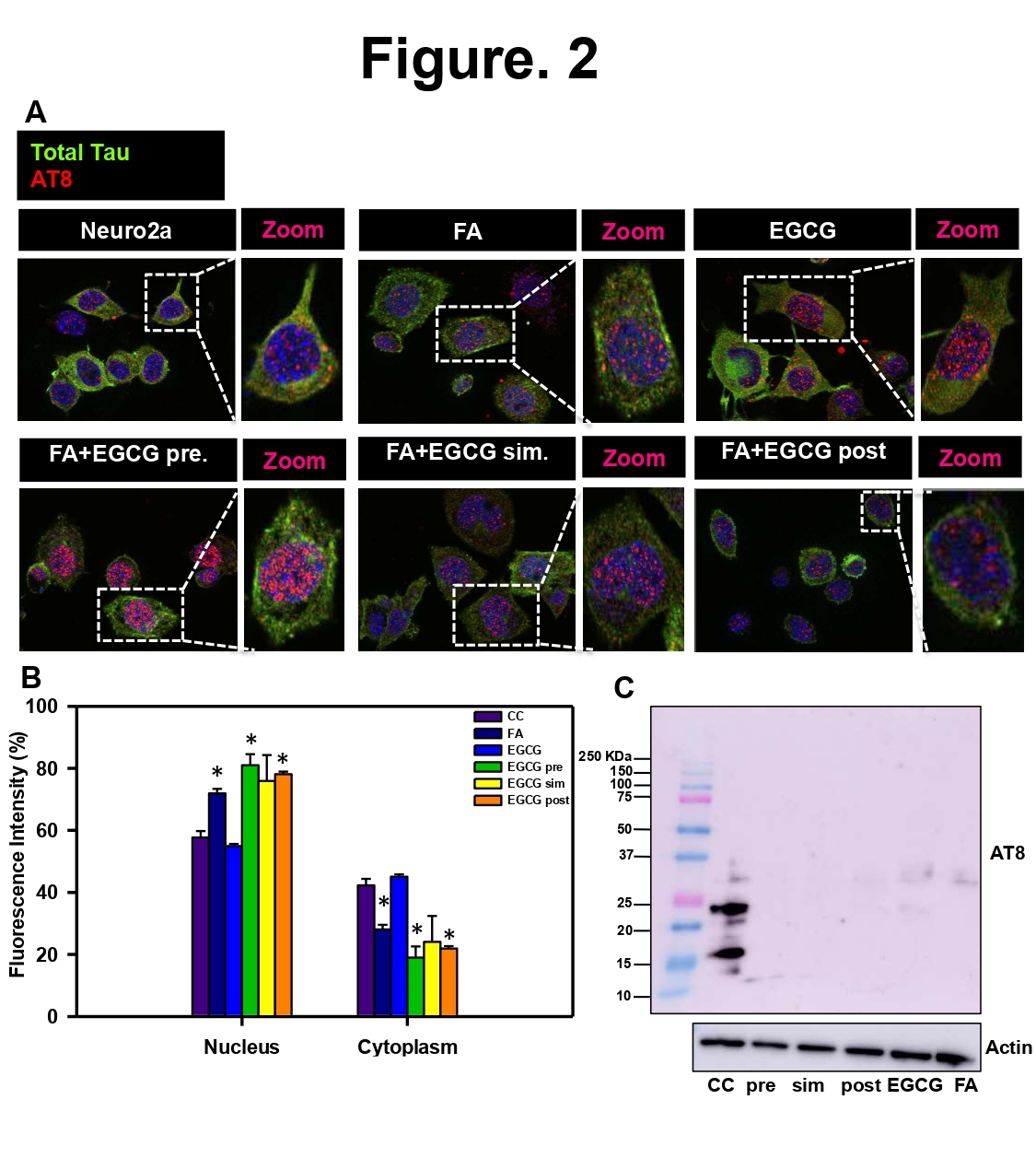 Figure 3: EGCG modulates Tau phosphorylation at AT100 (pS212/pT214) epitope. A) AT 100 positive Tau is observed distinctly in the cell and nuclear periphery. EGCG treated cells showed a reduced AT100 fluorescence as compared to positive control. Other treatment groups did not show change in AT100 fluorescence as compared to positive control. B) The fluorescence quantification reveals that EGCG pretreatment shows more AT100 positive Tau in the nucleus as compared to cytoplasm p<0.05. C) The western blot for AT100 epitope reveals degraded Tau only in control and EGCG treated cells.