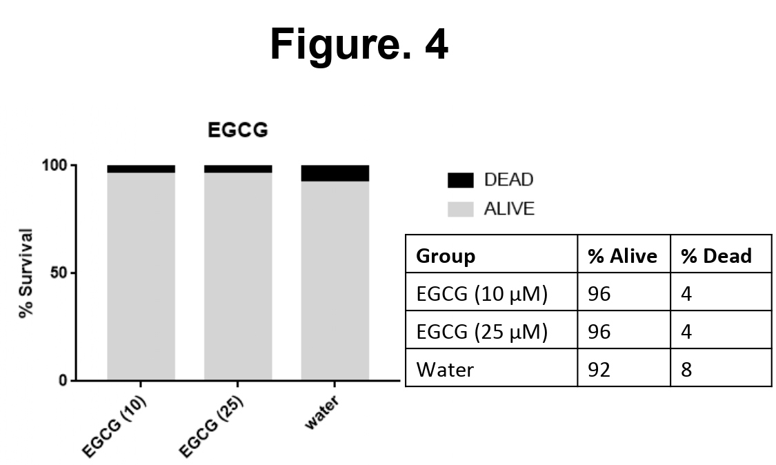 In order to check the in vivo toxicity of EGCG, the survival assay was carried on drosophila model of Tauopathy. The flies were grown in fly food supplemented with EGCG at 10, 25 µM and water as a vehicle control. The survival assay was carried out for 31 days. 25 flies were analyzed from each group and plotted as percentage alive and dead. It was observed that EGCG treatment showed 96% survival in drosophila and vehicle control showed 92% survival rate