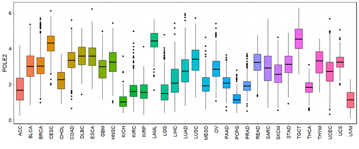 POLE2 was found to be significantly overexpressed in a majority of tumour types across TCGA datasets. Expression-level distributions are visualized using box plots utilized TCGA plot R package (v4.4.1). Elevated expression levels were particularly prominent in most of the cancers such as breast (BRCA), liver (LIHC), lung (LUAD and LUSC), and kidney (KIRP and KIRC) (Figure 1). This widespread upregulation suggests that POLE2 may act as a common oncogenic factor across diverse cancers. By comparing tumour samples with matched normal tissues, it became evident that POLE2 expression is consistently higher in malignant tissues, supporting its potential as a universal biomarker for tumour detection and progression.