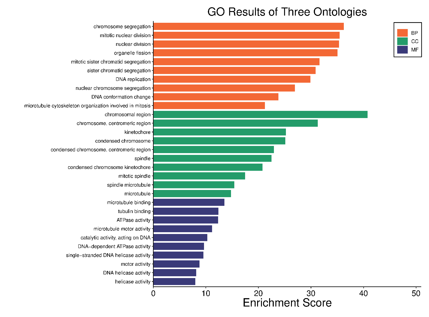 Figure 3. Gene Ontology (GO) enrichment analysis of POLE2-associated genes across pan-cancer datasets. The bar plot illustrates the top enriched GO terms classified into three categories: Biological Process (BP, orange), Cellular Component (CC, green), and Molecular Function (MF, blue).