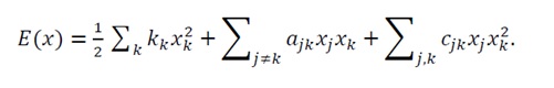 where a_ij and b_i are constants, and c_ijare coefficients of the nonlinear terms. We specifically assume that c_ij=0 for i≠j, meaning only quadratic terms involving a single variable are present (i.e., c_ii x_i^2). This simplifying assumption is valid in systems where higher-order interactions primarily manifest as self-regulatory or self-enhancing/inhibiting effects, rather than complex cross-component feedback loops. It allows for a clearer analytical treatment of the influence of individual component nonlinearities on the overall system stability. Future work will explore more general forms of cross-term nonlinearities. The proposed nonlinear energy function E(x) is defined consistently with the linear case: