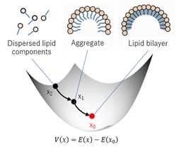 The lipid bilayer corresponds to the stable equilibrium x0 of the system, representing the spontaneous organization of amphiphilic molecules into a minimal-energy configuration. This equilibrium is not merely a metastable aggregate but a provably stable structure arising from the convexity of E(x)