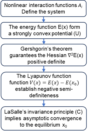 - Nonlinear regime – global convergence: Chapter 3 generalizes the analysis to a nonlinear energy landscape, incorporating higher-order coupling terms. Through Gerschgorin’s circle theorem [12] and LaSalle’s invariance principle [13], it shows that, under specified constraints, the system retains global convexity and every trajectory converges uniquely to the global energy minimum x0.