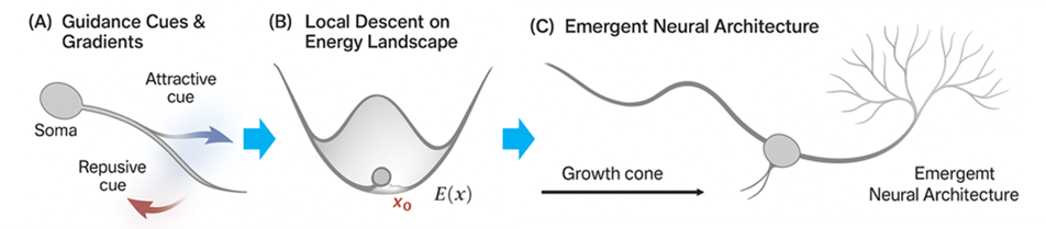 guaranteeing convergence to this stable configuration. In panel C, a balance between attractive and repulsive forces yields a self-organized neural architecture characterized by stable axonal trajectories, dendritic arborization, and coherent spatial patterning. Together, these panels provide a physical–morphogenetic interpretation of neural development: neural connectivity arises spontaneously—without centralized control—from the minimization of energy under multiple interacting constraints. This mirrors the broader thermodynamic principle that biological systems evolve by minimizing free energy to attain stable internal states, as articulated in Friston’s Free Energy Principle [24]. While Friston’s “free energy” refers to an informational variational quantity, the present energy E(x)