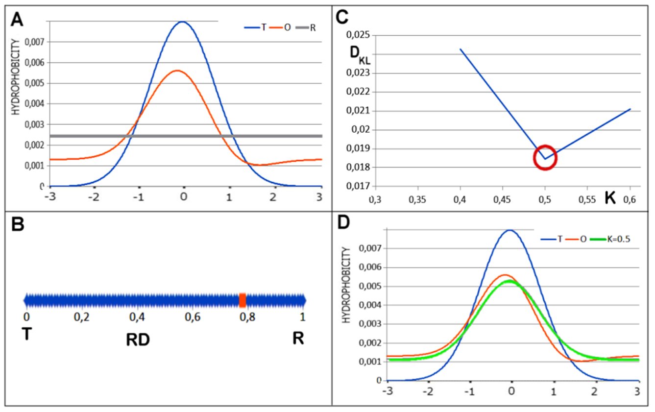 Figure 1: Graphical representation of the model reduced to 1D for ease of reference: A – juxtaposition of distributions: T (blue), O (red), R (gray). B – the RD value determined for the set in A is 0.785 and so the distribution O does not represent an arrangement with a hydrophobic core present. C – determination of K, the minimum value of DKL(O|M). D – juxtaposition of profiles: T, O and M with K=0.5.