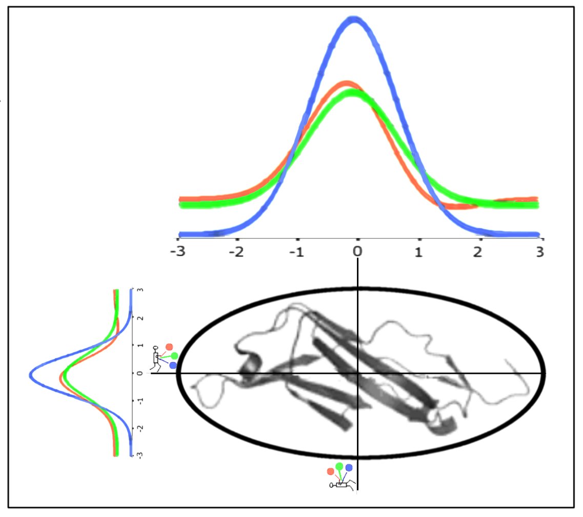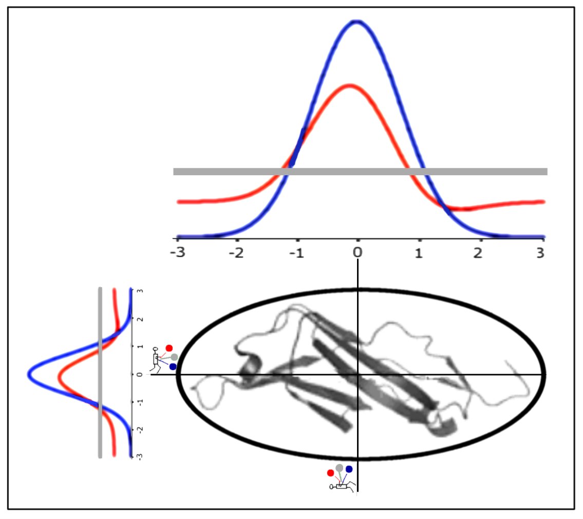 Figure 3: The protein encapsulated in ellipsoid (3D Gauss function – on presentation limited to 2D) appears to represent the observed hydrophobicity distribution which retraces the external force field expressed by M function (green line). The three detectors register the levels of hydrophobicity in protein. The best fit for observed distribution (red one) is the M distribution (green). The value of K for M distribution informs what is the degree of the environment difference in respect to polar water one (blue line).