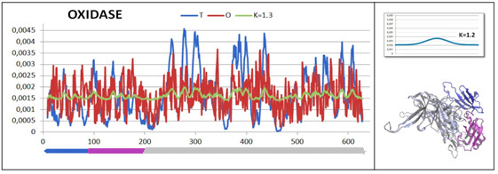 A high degree of distinctiveness of the decomposition O against T is shown by the enzyme E.C.1.4.3.21-primary-amine oxidase (PDB ID - 1AV4) [32]. It is a 620 amino acid chain protein within which three domains are distinguished: Dom1 (9-95), Dom2 (96-203) and Dom3 (204-627). The status of this protein is determined by the values: RD=0.701 and K= 1.3. The domains treated as individual structural units are characterized by the following parameters Dom1: RD=0.618, K =0.5 ; Dom2 : RD=0.493 K= 0.4; Dom3 : RD=0.630 K = 0.6.