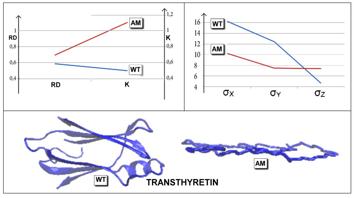 Figure 10:Juxtaposition of the parameters RD and K as well as σx, σy and σz for the native (WT) and amyloid (AM) forms of transthyretin together with a 3D presentation showing significant flattening of the chain structure as a component of the amyloid fibril.