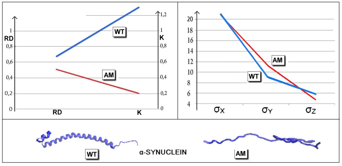 Figure 12: Juxtaposition of the parameters RD and K as well as σx, σy and σz for the native (WT) and amyloid (AM) forms of α-synuclein together with a 3D presentation showing flattening of the chain structure as a component of the amyloid fibril. The opposite relationship of RD and K for the native and amyloid forms of this protein to the previous examples can be seen.