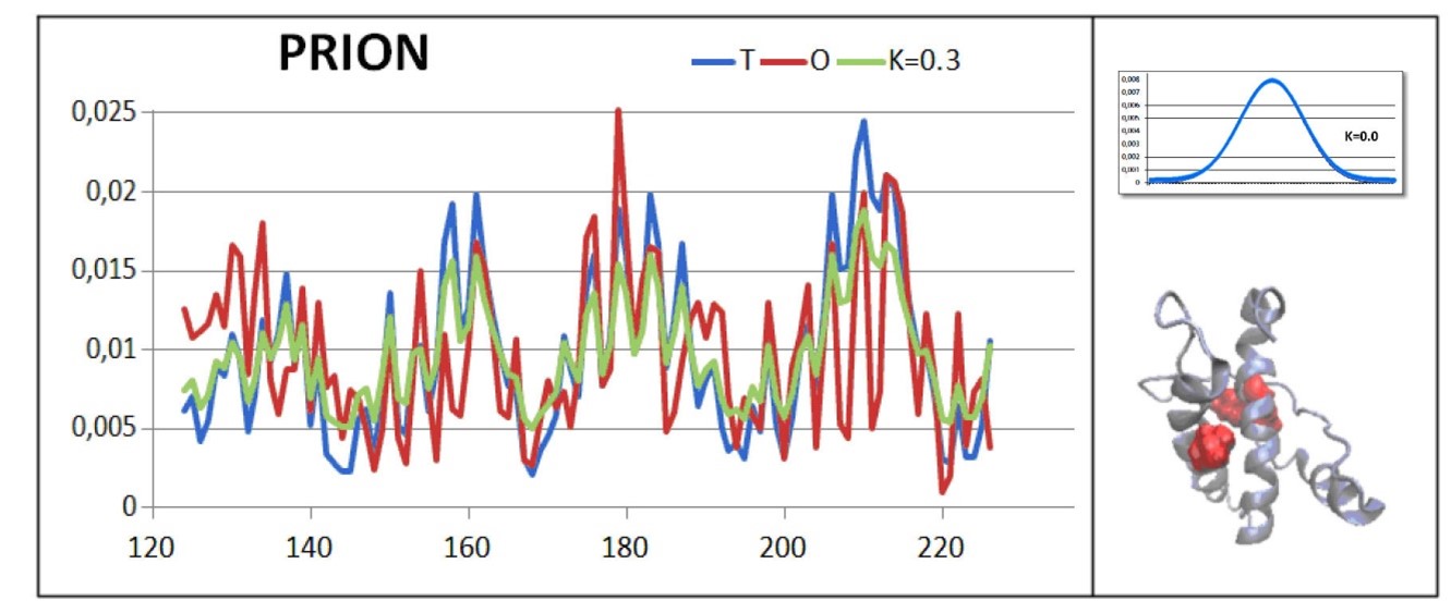 Figure 5. Characterization of the major prion protein domain prp (121-231) from a mouse: a set of profiles T, O and M for K=0.3 together with a 3D presentation highlighting (in red) the amino acids showing local maxima with a high hydrophobicity value consistent for distributions T and O. Inset – top right – plot of the profile of the idealized distribution reduced to 1D, with K=0.0. A profile for K=0.0 is provided for comparison to a profile with K=0.3 (Figure 4 – see the inset).