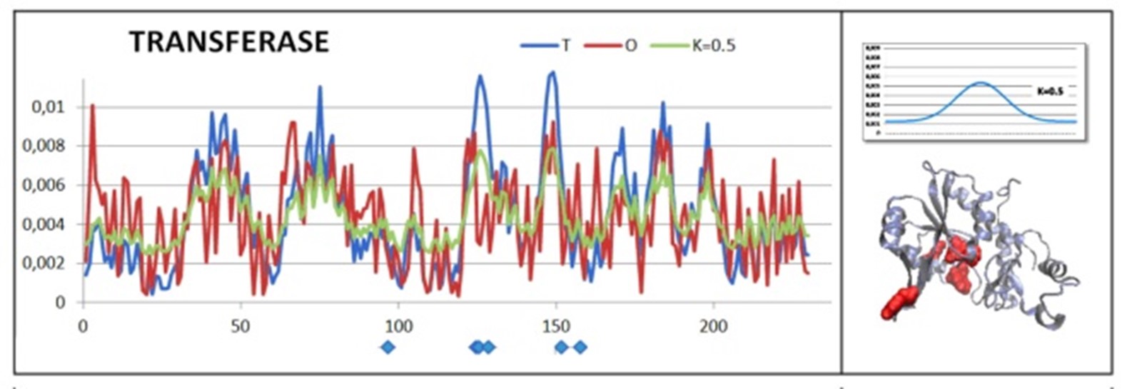 Figure 6: Characterization of giardia guanine phosphoribosyltransferase: a set of profiles T, O and M for K=0.5 together with a 3D presentation in which the catalytic amino acids are highlighted (in red; their positions in the chain sequence are highlighted on the horizontal axis with blue diamonds). Inset – top right – plot of the profile of the idealized distribution reduced to 1D, with K=0.5.