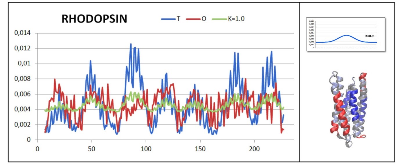 Another example illustrating the status with K=1.0 is the membrane protein bacteriorhodopsin (PDB ID - 1BM1) [31]. Here, the impact on significant dissimilarity to the conditions imposed by the water environment is clearly visible. Residues showing a deficit in hydrophobicity are present (the residues in blue on 3D presentation – Figure 7). These are positions with Oi levels significantly lower than expected against the expected high Ti values (Figure 7) These residues are identified as building cavities for a retinal bonding. Residues exhibiting redundant hydrophobicity are also evident – the residues that are in direct contact with the hydrophobic membrane (Figure 7 – 3D presentation – see the residues in red).