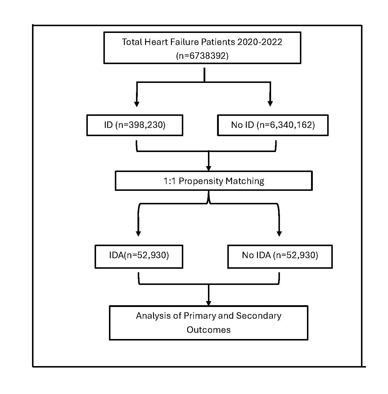We included adult patients (≥18 years) hospitalized with a primary diagnosis of HFrEF, identified using ICD-10 codes ranging from I5020 to I5043. The cohort was then stratified based on the presence of ID with or with coexistent anemia, which was defined using ICD-10 codes D50, D508, and D509. Patients with missing demographic or clinical variables were excluded from the analysis.
