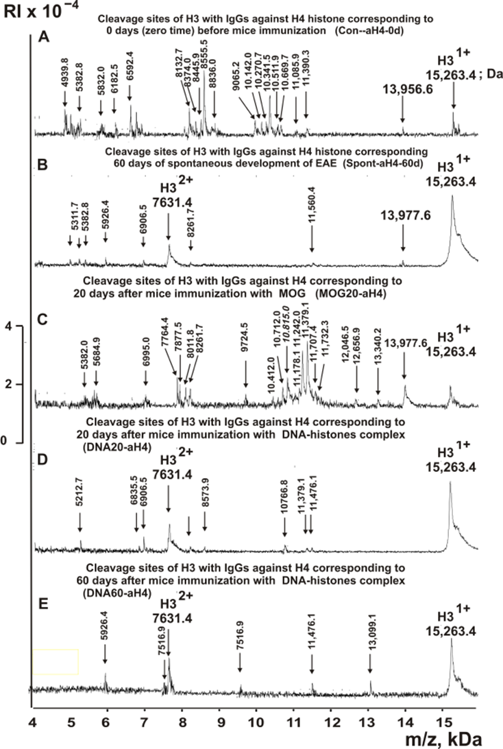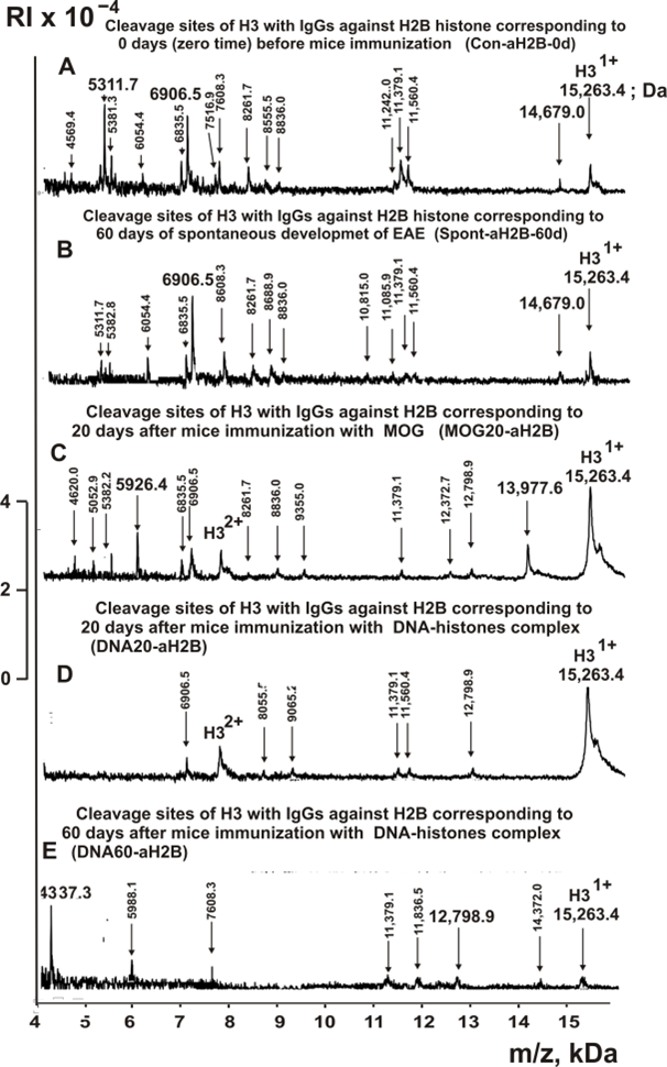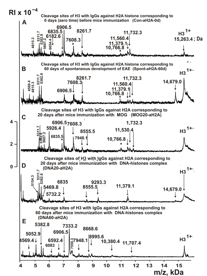 Results: IgG-Abzs against MBP and five individual histones showed unusual complexation polyreactivity and enzymatic cross-reactivity in the specific hydrolysis of H3 histone. All IgGs at zero time (3-month-old mice) against MBP and five individual histones according to MALDI mass spectrometry demonstrated from 5 to 21 different H3 hydrolysis sites. The spontaneous evolution of EAE during 60 days results depending on IgGs against various histones in a powerful increase or decrease in the type and number of H3 hydrolysis sites. Mice treatment with MOG or DNA-histones complex leads to changes in IgGs activities and a specific alteration in type and number of H3 hydrolysis sites in comparison with sites corresponding to zero time and spontaneous development of EAE. The minimum number (5) of different H3 hydrolysis sites was revealed for IgGs against ?4 (60 days after immunization of mice with DNA-histones complex), while the maximum (21) to IgGs against H1 and MBP (60 days after spontaneous EAE development).