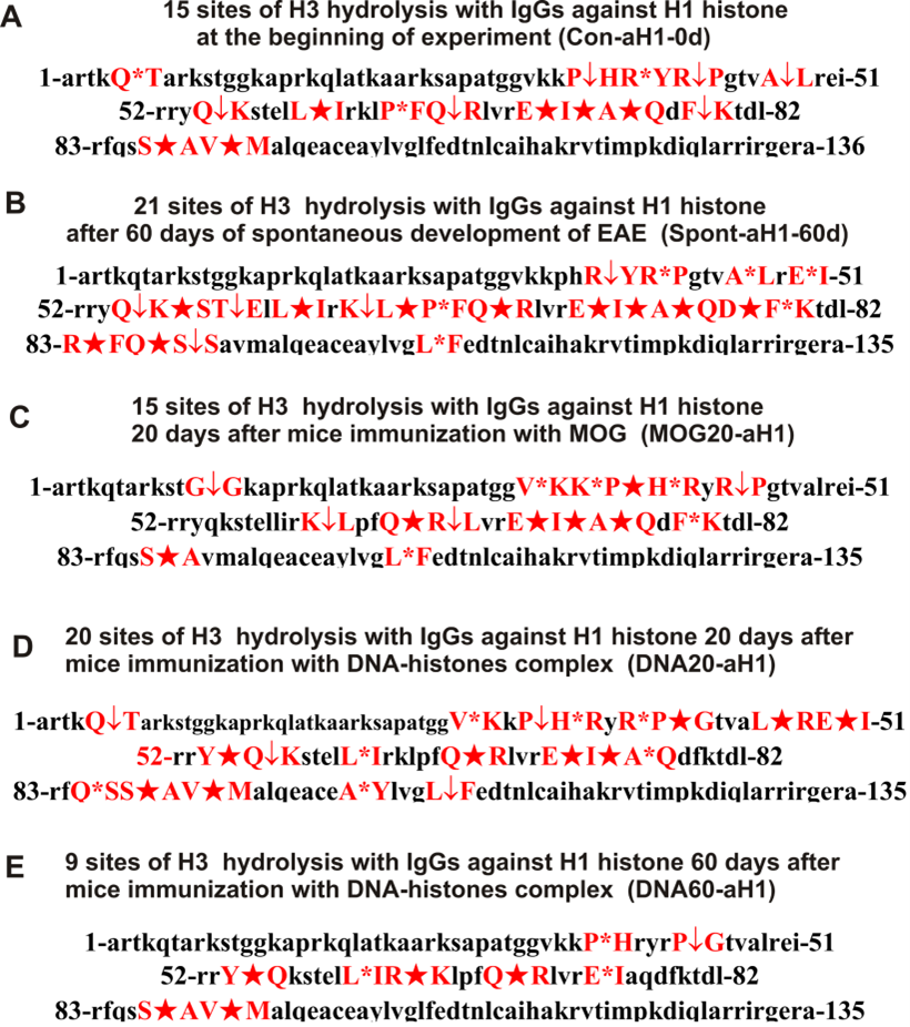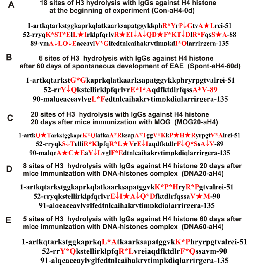 As shown in Tables 2-4, 29 IgG preparations exhibit different major sites in H3 histone hydrolysis. Therefore, it is interesting to understand why at different stages of spontaneous development of EAE and after mice treatment with MOG and DNA-histones complex, the formation of abzymes hydrolyzing H3 histone at different sites is possible. For this, it is helpful to analyze some literature data.
