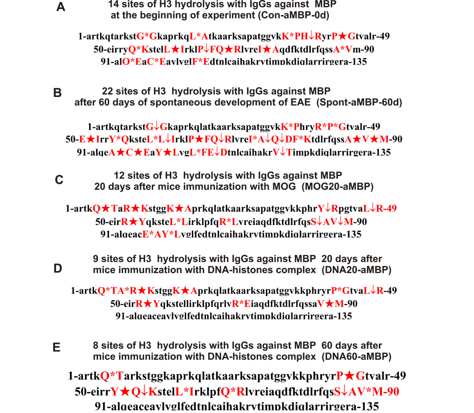 Thus, at different stages of EAE achievement, all histones and MBP and their complexes could represent different fragments of protein sequences that mimic the transition states of hydrolysis of bonds between AAs for the formation of Abzs. This may lead to the fact that at different stages of EAE development, abzymes against histones or MBP may be formed against different proteins sequences. This may be the reason why Abzs against the five histones corresponding to spontaneous and antigen-induced development of EAE differ greatly in the number and type of hydrolyzed bonds.