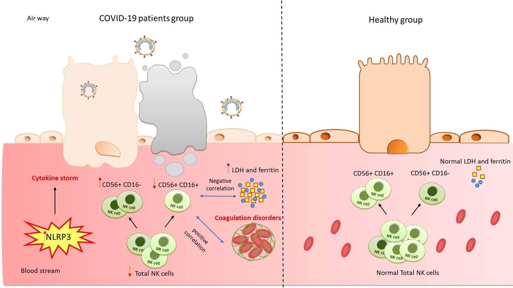 The study demonstrated a significant reduction in natural killer (NK) cell population, particularly in specific NK cell subsets, in COVID-19 patients compared to healthy controls. These findings are consistent with previous studies that have reported impaired NK cell function in severe COVID-19 cases. Interestingly, an unconventional subset of NK cells, CD56dim CD16-, was found to be increased in COVID-19 patients. The increase in CD56dim CD16- NK cells suggest a potential compensatory mechanism or altered NK cell maturation in response to SARS-CoV-2 infection [1].
