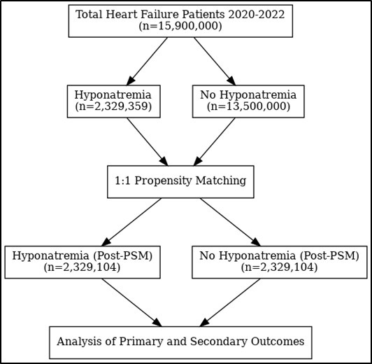 The study cohort comprised adult patients (aged 18 years and older) admitted with a principal diagnosis of heart failure (HF), identified using standardized ICD-10 codes (I5020–I5043, I501, I5030–I5033, and I509). Individuals were divided into two groups: HF patients with hyponatremia and those without. Cases with hyponatremia were defined by the presence of ICD-10 code E87.1. Records with incomplete demographic or clinical information were excluded from analysis.