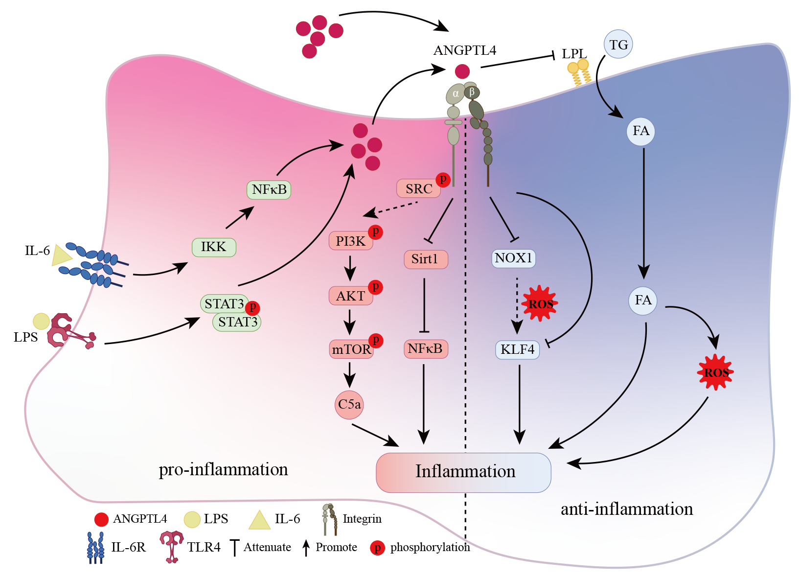 In summary, there is strong evidence that ANGPTL4 plays a dual role in the inflammatory response. Further studies are needed to elucidate the regulatory mechanisms, including the conditions that elevate ANGPTL4 expression in specific diseases, the extracellular or intracellular signaling pathways that mediate ANGPTL4 signaling, or how the outcome of this regulation affects only the local cellular microenvironment or leads to systemic inflammation.