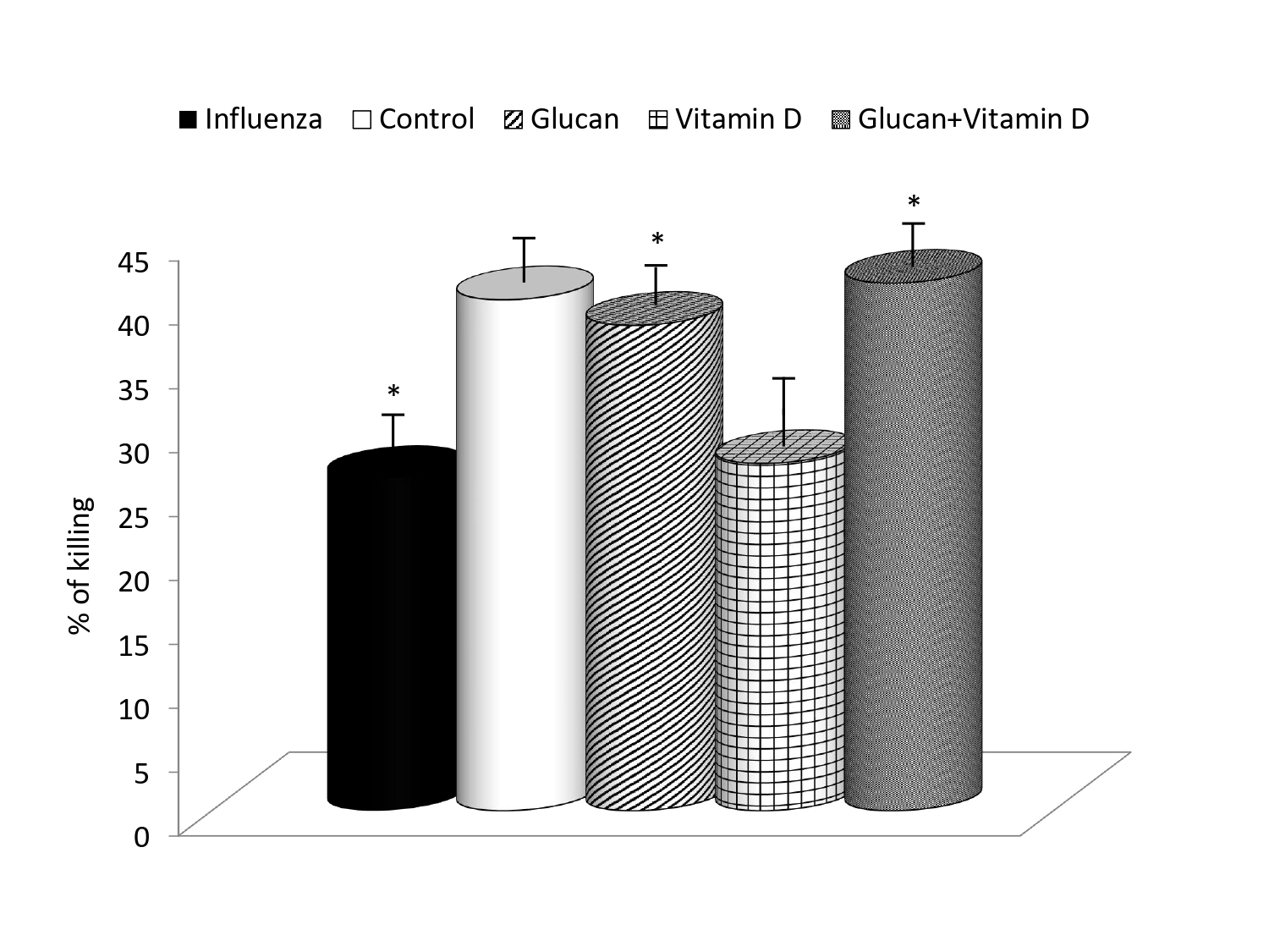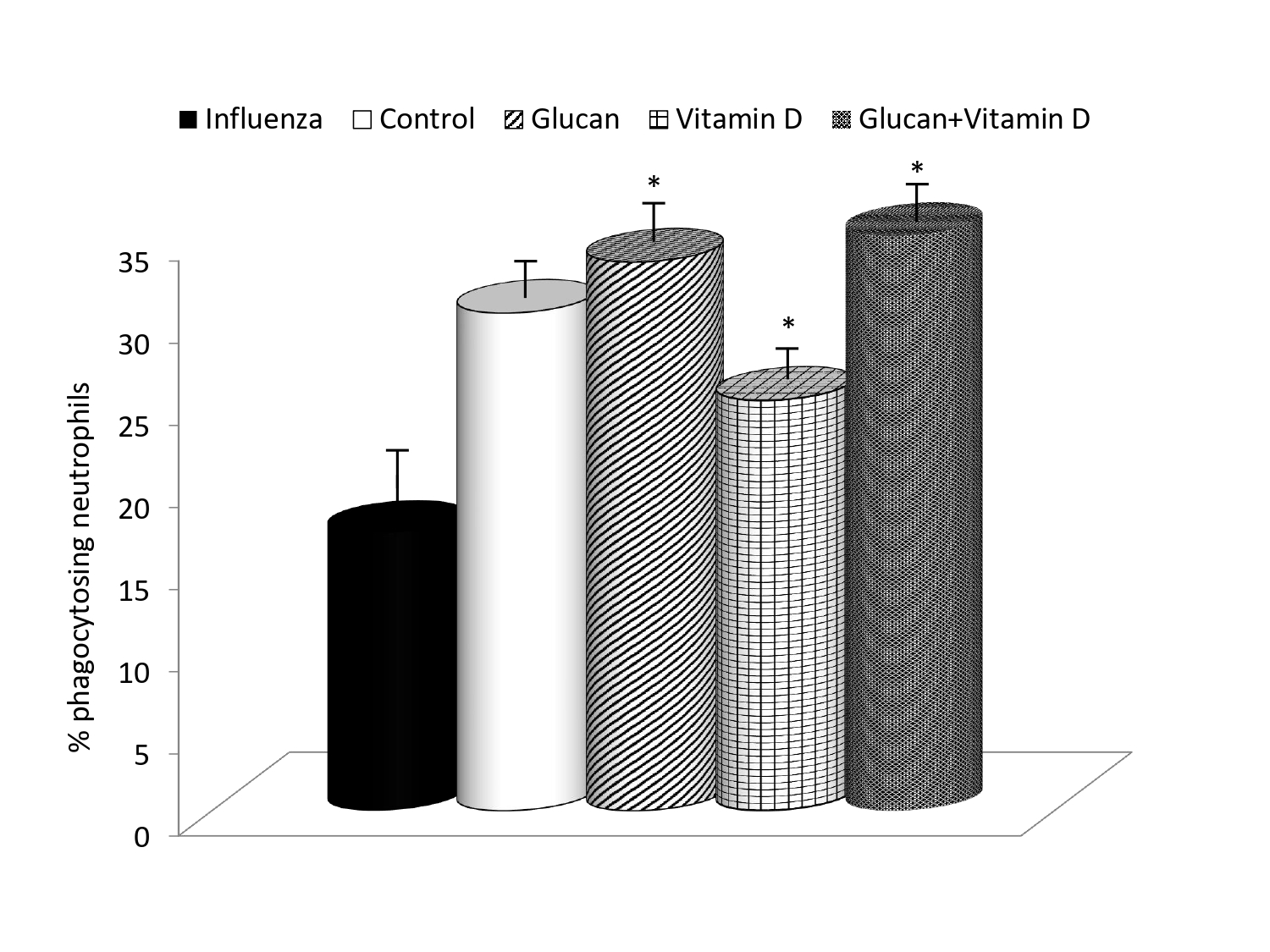 Glucan is known to improve immune reactions, most of all cellular immunity. We started with evaluation of the effects on phagocytosis. We used a well-established model of 2-hydroxyethylmethacrylate microparticles known for minimal nonspecific adherence to the cell membrane and found that influenza challenge significantly lowered phagocytic activity of peripheral blood neutrophils (Figure 3). All three supplemented groups showed significant improvements of phagocytosis, with the supplementation with glucan+vitamin D combination has the strongest effects.