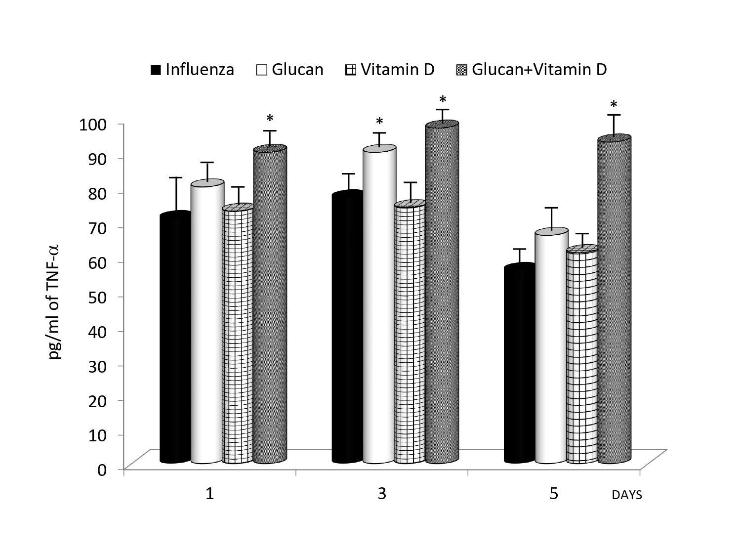 Figure 6: Evaluation of TNF-α levels in lungs. Influenza-treated (Influenza), Influenza + glucan (Glucan), Influenza + vitamin D (Vitamin D), Influenza + glucan + vitamin D (Glucan+vitamin D) or PBS (Control). Data represents mean ± SD. *Significant differences between individual supplemented groups and Influenza group at P<0.05 level.