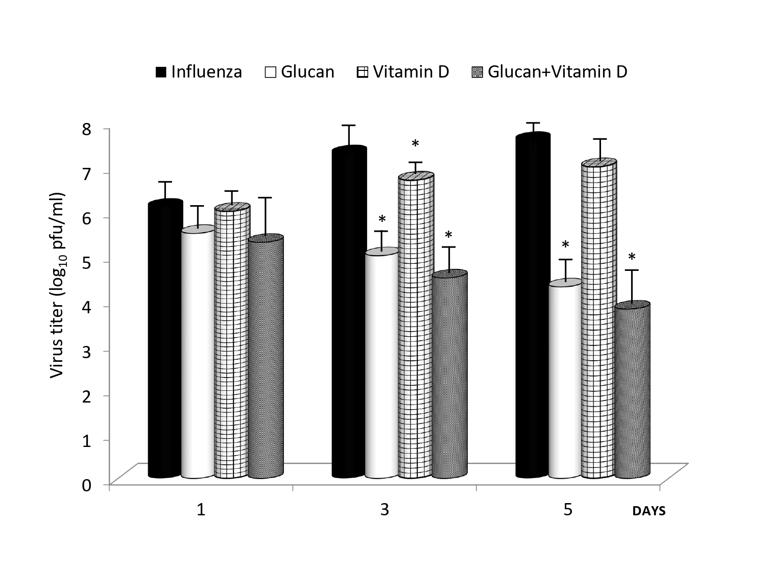 Influenza epidemics occur every year in the United States and worldwide with app. 500,000 people dying every year [16]. In addition, the current coronavirus infection focused out attention on possible ways how to improve the immune system even more than before. Various immunomodulators have been studies, partly alone, partly in combination with vaccines. Results often shown improvements of the antiviral response [17,18]. Biological effects of glucan are well established. Immune system is one of the biological systems which benefits most from glucan actions. The antiviral activity of glucan is much less studied and our knowledge is limited. However, some studies exist. One study suggested that glucan treatment might be effective for the prevention of influenza in animals [19]. Strong antiviral effects of glucan on same type of infection were confirmed on swine model [20]. Our own studies found similar effects, both when the mice were supplemented by glucan alone or in combination with sulforaphane [10,11]. Vitamin D has been implicated in the pathophysiology of numerous inflammatory diseases such as rheumatoid arthritis of Crohn disease. Supplementation with vitamin D lowers the risk of development of diabetes mellitus [21]. In addition, vitamin D mitigates dangerous effects of bacterial infection on the mucosa [22]. Deficiency in vitamin D results in impaired colonic antibacterial activity [23]. As we previously observed the synergistic effects of glucan and vitamin D supplementation on various aspects of immune reactions [8,9], we decided to evaluate the effects of glucan and vitamin D combination on stimulation of immune responses to influenza challenge. Influenza infections triggers a whole cascade of immune reactions, including changes in phagocytosis, antibody formation and secretion of various cytokines, both with immunomodulatory effects and closely associated with pathology of infection. The increased production of cytokines occurs in the spleen, lymph nodes, heart, and lungs [24,25]. Our finding showing that supplementation with glucan and/or glucan and vitamin D returned the virus-mediated depression of phagocytic activity to normal levels supported the older data showing glucan improving innate immune reactions depressed by various toxins [2]. Similar changes were found in case of NK cell activation and production of specific antibodies. The increased antibody levels are consistent with the smaller weight loss and lower morbidity in animals supplemented with glucan and particularly with glucan and vitamin D combo.Changes in cytokine production are more difficult to interpret, as the full contribution of individual cytokines produces as a result of viral infection is unknown. However, IFN-γ has protective effects against infections; some others (such as IL-1, IL-6, and TNF-α) are more involved in inflammatory phase of infection. Our data showed significant improvements by glucan and vitamin D combinations of the already elevated levels of IL-1β, IFN-γ and TNF-α. The kinetics of time changes corresponds to the older data [14]. Our results confirmed our previous studies on glucan and influenza infection. As the previous experiments used different types of glucan, we can conclude that these glucan effects are general and not dependent on a special type of glucan. On the other hand, it is still true that individual glucans differ in the strength of their activities. Based on our data we can conclude that the positive effects of the glucan-vitamin D combination are based on stimulation of both humoral and cellular immune reaction and result in significant lowering of the viral load.
