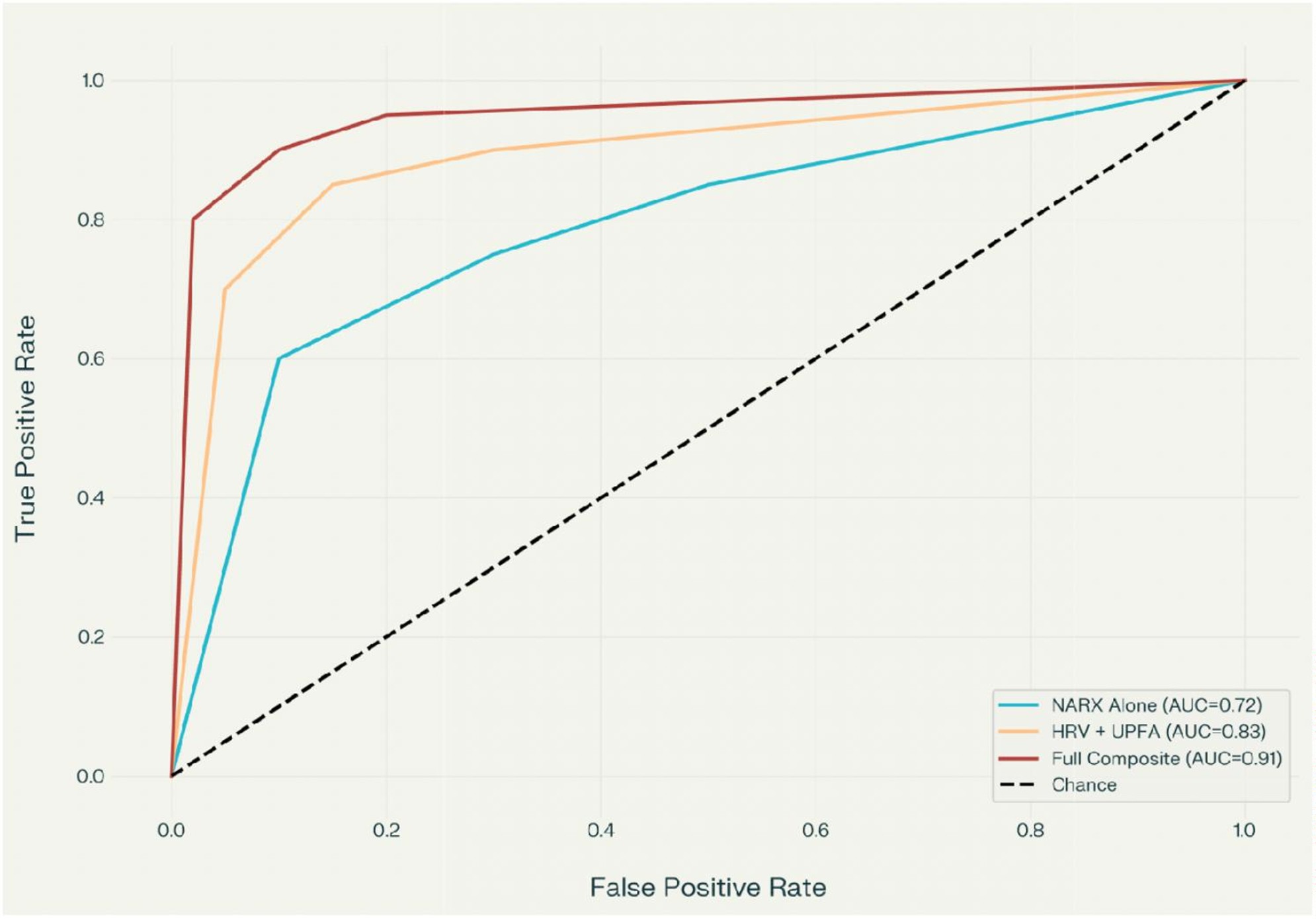 The composite risk model integrating NARX, HRV, and UPFA variables demonstrated higher apparent AUC and sensitivity for identifying high-risk status than NARX alone. Bootstrap-based internal validation revealed some optimism in these apparent performance estimates; the optimism-adjusted AUC for the composite model was modestly lower than the in-sample value but remained higher than that of NARX alone, indicating incremental discriminative value while underscoring the likelihood of overestimation in this single-center retrospective dataset. In view of the modest sample size, small control group, and lack of an external validation cohort, these performance metrics are interpreted as exploratory and hypothesis-generating, and the model is presented as a preliminary tool that requires confirmation in larger, independent samples.