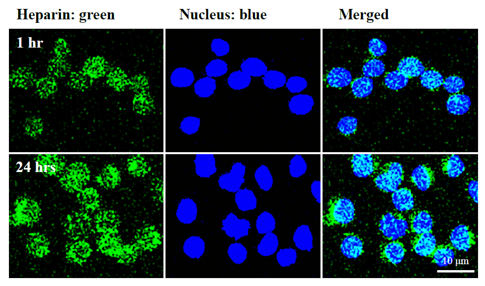 Figure 1. Fluorescent cell imaging of cultured U937 pre-monocytes for heparin internalization. The cells were initiated to divide from G0/G1 in hyperglycemic medium in the presence of 1 μg/ml of fluorotagged FITC heparin (green), and nuclei were stained by DAPI (blue). The cell imaging was done by fluorescent confocal microscopy at 1 hour and 24 hours. Internalization of the fluorotagged heparin into the cytoplasm is apparent.