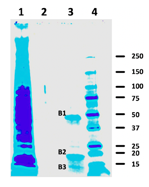 Figure 2 shows an SDS-PAGE gel with an aliquot of the total cellular fraction (lane 1), the excess heparin specificity control (lane 2), and the biotinylated heparin alone (lane 3). Two major (B1 and B2) and one minor (B3) bands were found in lane 3 that were absent in lane 2, providing evidence that the biotinylated heparin specifically bound to these proteins on the cell surface and selectively extracted them from the plasma membrane (lane 1). The apparent molecular weights for two major bands, B1 and B2, were ~47.4 and ~17.5 kDa respectively, and one for B3 was ~13.6 kDa.