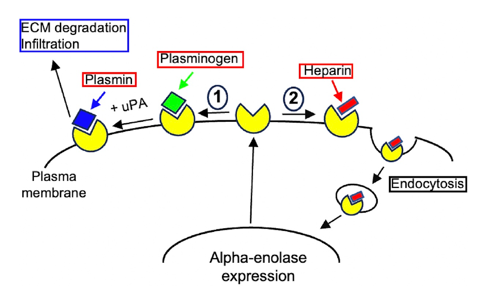 On the cell surface, alpha-enolase has been shown to act as a receptor for plasminogen binding in the formation of serine protease plasmin from plasminogen (PLG) under physiological stimuli such as urokinase-type PLG activator (uPA) or tissue-type PLG activator (tPA) [35]. This promotes extracellular matrix degradation and subsequent pathogens, immune cell and cancer cell invasion into tissue that leads to infection, inflammation and metastasis formation [31, 32, 35]. Thus, alpha-enolase can act as a receptor on the cell surface mediating bacteria adherence and internalization that leads to infection and the efficient dissemination of bacteria [31]. Such a mechanism has been proposed in the lung epithelial cell infection by bacteria, in which bacteria and epithelial cell surface enolases interact with each other via the RNA that serves as a bridge molecule thereby facilitating the pathogen dissemination [31]. Moreover, previous studies have shown that the enolase can be secreted extracellularly either in the form of an exosome or as a free molecule [31], and in this case, it can induce the migration of immune cells and promote the proinflammatory phenotype of immune cells [31,35].