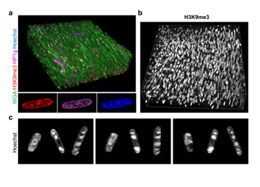 Since epigenetic modifications on chromatin and nuclear morphology have been identified as key mediators of CM proliferation and cardiomyopathies [23,31-33], we tested whether these features could be resolved by our technique. Nuclear morphology and subnuclear heterochromatin domains that stain positive for canonical heterochromatin markers Heterochromatin Protein 1 (HP1) and histone H3 Lysine 9 trimethylation (H3K9me3) [23], were clearly resolved in 3D (Figure 3).