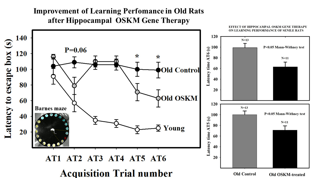 We assessed the cognitive performance of young (3.5 mo.) untreated rats and old (25.3 mo.) treated and control rats. Treatment was carried out by intrahippocampal injection of OSKM adenovector. Learning and spatial memory performance were assessed by means of the Barnes maze test. The learning performance of the OSKM-treated old rats was significantly improved compared to that of the control old counterparts (Figure 1). A marginal (P=0.06) improvement in the spatial memory was recorded in the treated versus control old rats. OSKM gene expression induced no pathological changes in the brain. The morphology and number of hippocampal cell populations like astrocytes and mature neurons did not show any changes with the treatment in the old rats as compared with the control old counterparts. The rat pan tissue DNAm age marker (Horvath epigenetic clock) revealed that old OSKM gene-treated rats show a trend towards a decrease in epigenetic age [13].