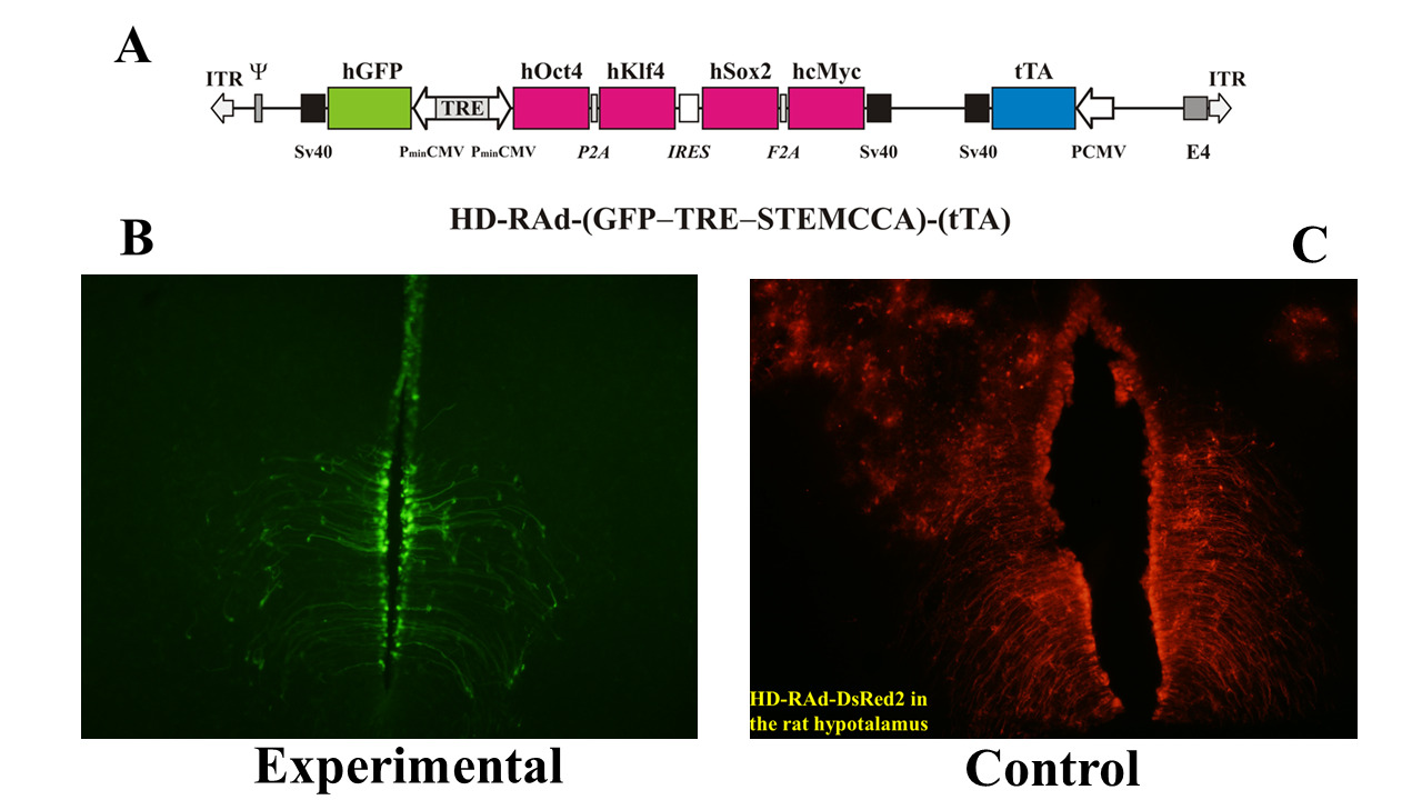 Figure 2: Panel A The figure illustrates the basic components of HD-RAd-STEMCCA-GFP-Tet-Off genome [16]. Panel B- Expression of GFP from the adenovector HD-RAd-STEMCCA-GFP in the third ventricle of the rat hypothalamus 6 days after vector injection in the lateral ventricles. Notice the processes of the ependymal tanycytes forming an extensive network in the hypothalamic parenchyma. Obj. 20X. Panel C- Expression of DsRed2 from the control adenovector HD-RAd-DsRed2 in the rat hypothalamus 30 days after vector injection. Notice the processes of the ependymal tanycytes forming an extensive network in the hypothalamic parenchyma. Obj. 10X. Abbreviations- GFP: Humanized Green Fluorescent Protein; TRE: Tetracycline Responsive Element; tTA: Chimeric Regulatory Protein; PminCMV: Cytomegalovirus Minimal Promoter; SV40pA: Polyadenylation Signal; ITR: Inverted Terminal Repeats; ψ: Packaging Signal.
