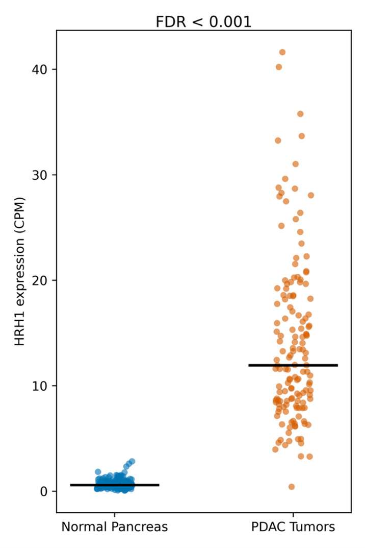 Figure 1 shows the expression of HRH1 in patients with PDAC compared to subjects with a normal pancreas. PDAC patients with higher median expression of HRH1 have shorter survival than those with lower median HRH1 expression [23]. Expression of HRH1 in 14 human PDAC cell lines from the Cancer Cell Line Encyclopedia [24] is substantially higher than that of the other 3 HRHs, implying that PDAC cancer cells preferentially express HRH1. HRH1 is also more highly expressed in PDAC patient-derived organoids than in organoids from normal pancreas, further evidence that HRH1 is present in PDAC cancer cells [23].