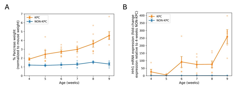 Figure 2. (A) Pancreatic weight (normalized to total body weight) in KPC and control (NON-KPC) mice from weeks-4 to 9. The data are shown as mean ± SEM (n=4–8) at each time point. The increase in pancreas weight in KPC mice results from their PDAC tumors. (B) HRH1 mRNA expression (using qPCR) in pancreatic tissue of KPC (n= 5–7) and control (NON-KPC) (n=3–6) mice from 4 to 9 weeks of age. The data are expressed as mean ± SEM (Adapted from [23]).