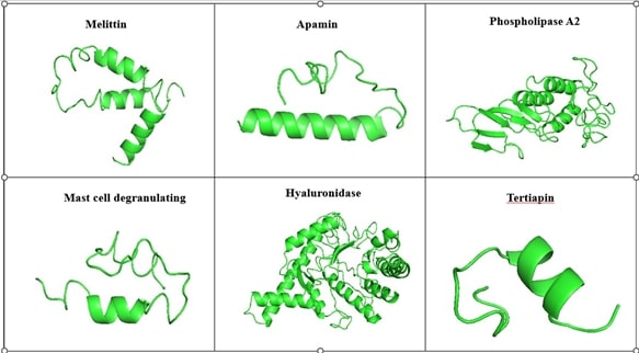 5. Wehbe R, Frangieh J, Rima M, El Obeid D, Sabatier JM, Fajloun Z. Bee venom: Overview of main compounds and bioactivities for therapeutic interests. Molecules. 2019 Aug 19;24(16):2997.`
