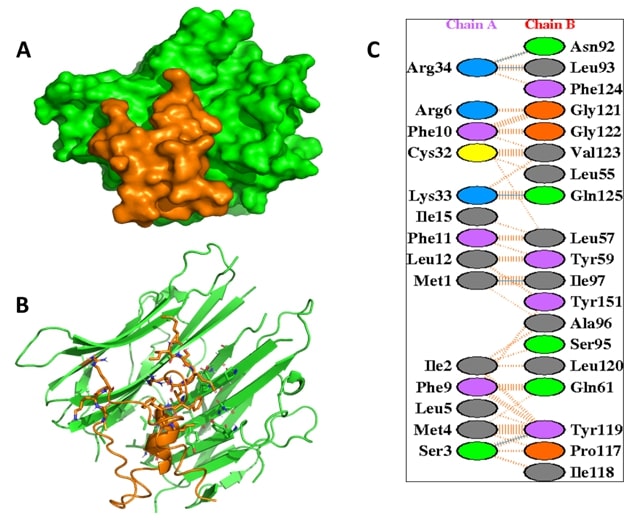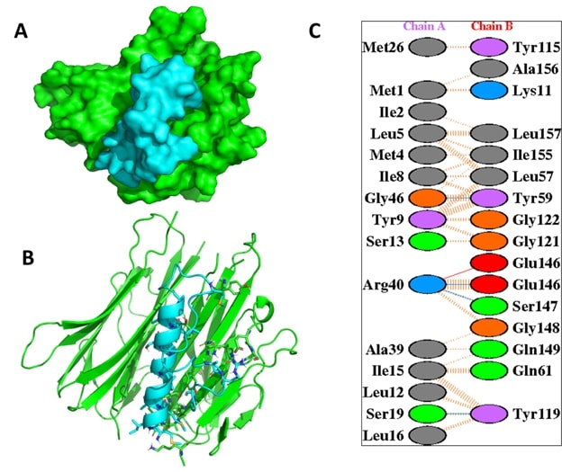 Figure 2. The interaction analysis of the TNF-α with Mast Cell Degranulation (MCD). (A) illustrates the surface view of the complex and (B) represents the interaction of of TNF-α (green) with MCD peptide (orange). The key residues of TNF-α involved in non-covalent interaction with MCD (C).