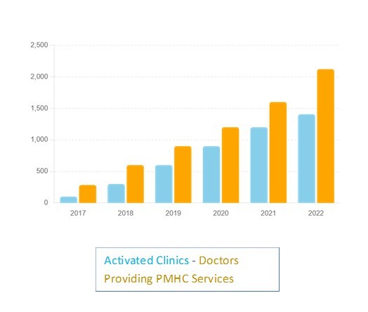 Methods: This study reviews three stages of integration: early training programs (1995–1999), the pilot PMHC program in the Eastern Province (2003–2016), and nationwide implementation (2017–2022). Data from 1,406 PHC centers, covering 114,068 patients and 329,016 visits, were analyzed. Training initiatives targeted 8,981 providers, emphasizing the Five-Step Model and a Training of Trainers (TOT) strategy.