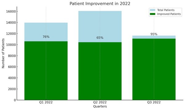 Training courses A total of 953 training courses were conducted to prepare PMHC providers. These courses targeted 8,981 PHC physicians and nurses, consisting of 70% general practitioners (GPs), 7% consultants, and 23% specialists, with 71% of the participants being Saudi nationals (Figure 2). Serviced patients and follow-up visits Between January 2017 and September 2022, PMHC providers successfully served 114,068 patients through 329,016 visits (Figures 3 and 4). Notably, female patients comprised 60% of the total population served. Age group distribution was with age ranged were 20% (18-25 years), 35% (26-40 years0, 30% (41-60 years), 15% (60+ years). Tables representing these age and gender distributions can be created for visual clarity in future presentations or reports. Management outcomes of 2022 During the first three quarters of 2022, a total of 32,124 patients, representing 77.2% of the 41,640 patients seen, showed improvement and responded well to the PMHC provider’s management of their mental health conditions. The improvement rates were as follows (Figure 5): - First quarter: 10,606 patients (76% improvement rate); second quarter: 10,438 patients (65% improvement rate); third quarter: 11,080 patients (95% improvement rate). Additionally, 7,114 patients (17%) were referred to psychiatric hospitals between January and September 2022 (Figure 6). Evidence before this study Before undertaking this study, the authors conducted an extensive review of existing literature and resources. The sources included databases such as PubMed, Scopus, and Google Scholar, as well as journal and book reference lists. The search criteria were broad, including studies published between 1995 and 2022, and were not limited to English language publications. The search terms used included "mental health integration," "primary health care," "Saudi Arabia," "mhGAP," and "Alma-Ata Declaration." There was a gap in the mental healthcare at the level of PHC centers’ services. Added value of this study This study provides a detailed account of the progressive efforts and achievements in integrating mental health care into PHC services in Saudi Arabia from 1995 to 2022. Unlike previous studies, this research offers a longitudinal perspective, documenting three distinct stages of integration and highlighting the strategies, outcomes, and lessons learned at each stage. The study showcases the effectiveness of the PMHC program in the Eastern Province, Saudi Arabia and its subsequent generalization across the country. It also emphasizes the innovative training strategies, such as the Training of Trainers (TOT) approach and the Five-Step Model (AlKhathami Approach), which have significantly improved the capacity of PHC providers to manage mental health issues. Implications of all the available evidence The findings of this study have several implications for practice, policy, and future research.
