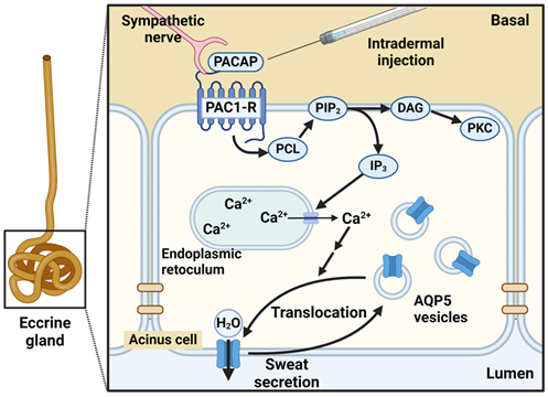 Figure 1: Schematic intracellular signaling mechanism of PACAP in eccrine sweat secretion. Created with BioRender.