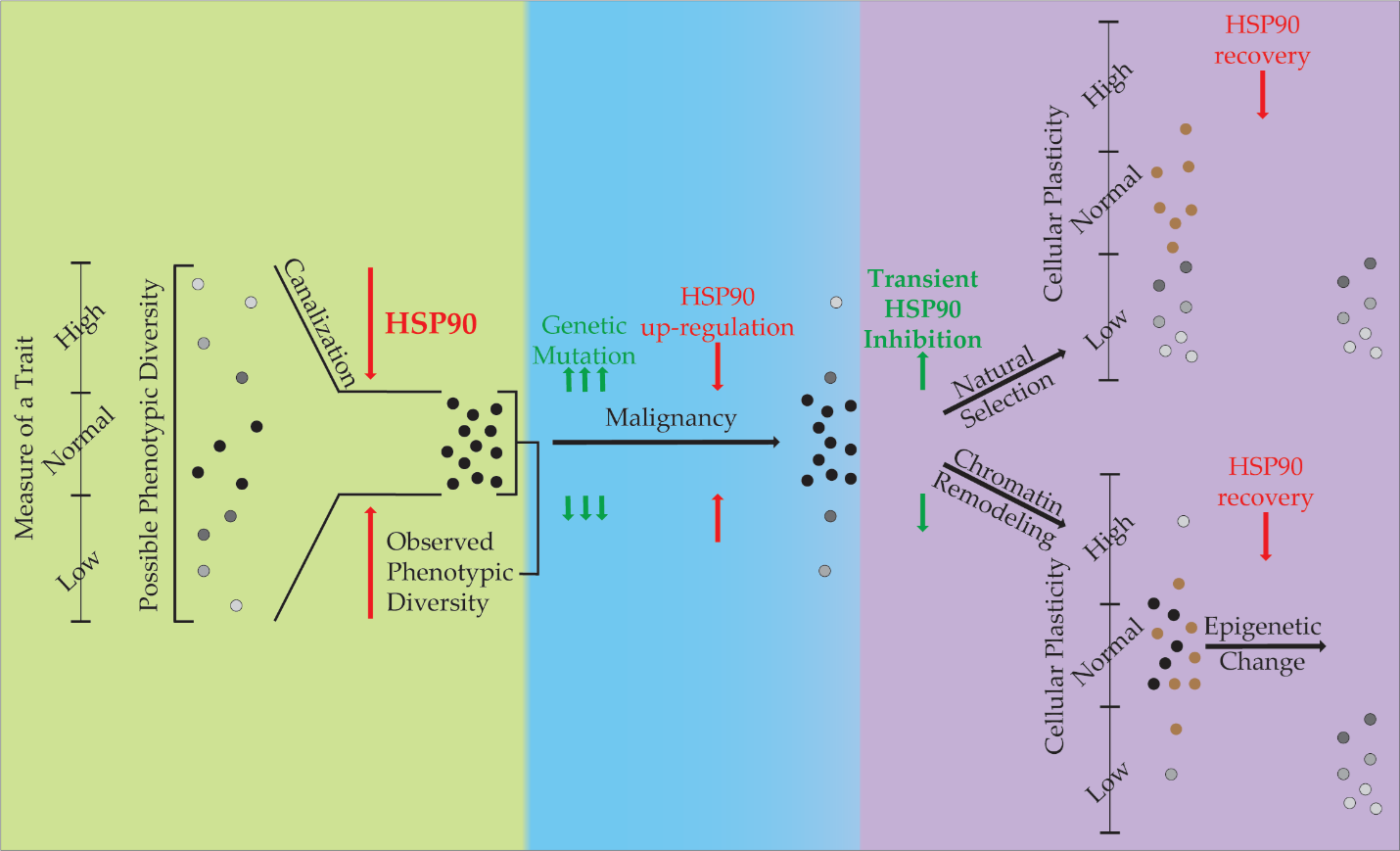 Figure 1. The Role of HSP90 in Phenotypic Diversity and Plasticity. This diagram describes the role HSP90 performs in canalization of phenotypes during evolution (green), its role in restriction of phenotypes during malignancy (blue), and two hypotheses for its role in our experiments with regards to phenotypic plasticity (purple). Phenotypic variance is displayed vertically with HSP90 restricting its expression through canalization. Cells that exist within the ‘normal’ phenotypic range are in black, while others are shown in grayscale. Cells shown in brown are those that die during inhibition by HSP90.