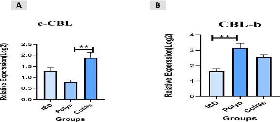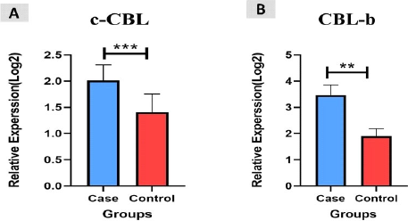 Figure 1. The relative expression levels (−ΔCt) of c-CBL, CBL-b and β2M. A. shows the differences in c-CBL expression between all the study groups. B. shows the differences CBL-b expression between all the study groups. (***: P<0.003, **; P<0.004).