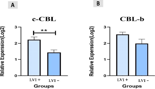Figure 4. The relative expression levels (−ΔCt) of c-CBL and CBL-b levels. A. shows the differences in c-CBL levels between Lymph vascular invasion in CRC patients. B. shows the differences in CBL-b levels between Lymph vascular invasion in CRC patients. (**: P<0.003, P<0.07).