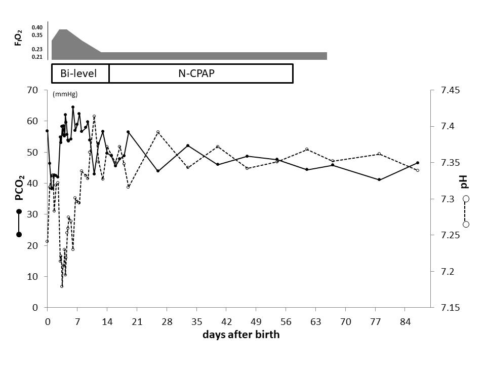 Figure 1: Transition of respiratory management and blood gas analysis. The value of PCO2 remained high from 4 to 10 days of age. During that time, the respiratory management of bi-level CPAP thoroughly allowed permissive hypercapnia to avoid the exacerbation of respiratory condition. After 10 days of age, the high PCO2 level gradually decreased, and the pH could be maintained at around 7.35.