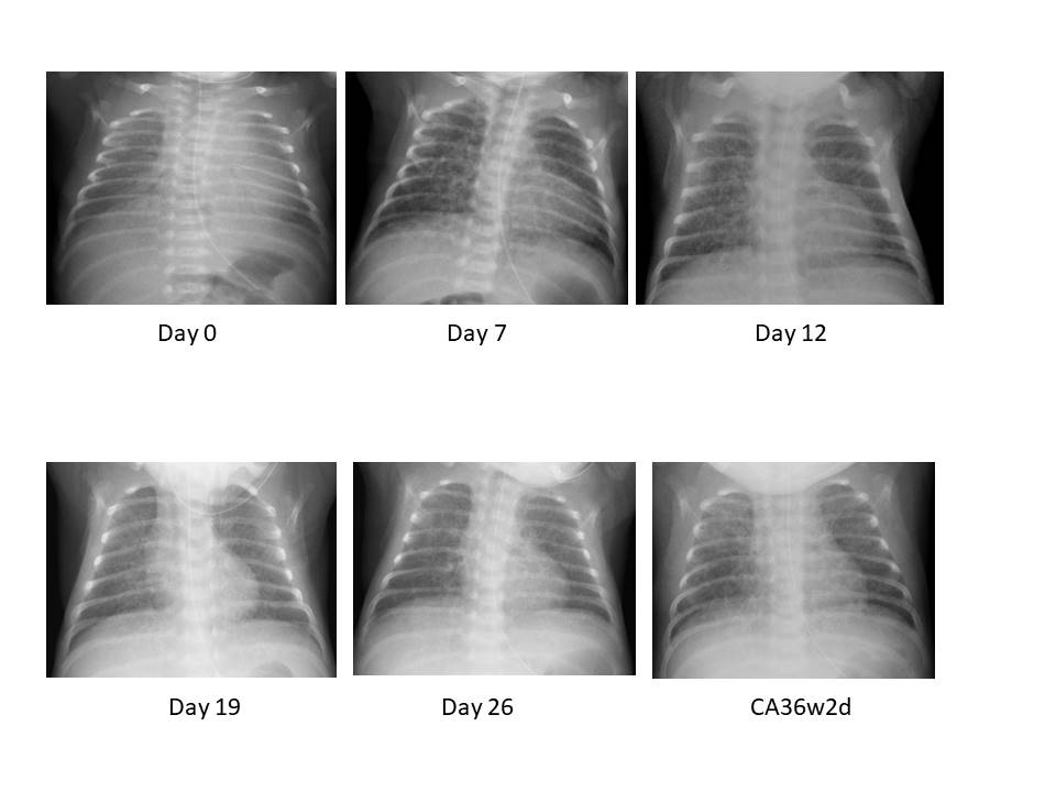 Her renal tubular damage was estimated to have been mild. Therefore, although only temporarily, we felt that the infant’s prognosis was poor because of increased revels of u-BMG and KL-6. However, from the nursing perspective, efforts were made to stabilize the infant’s respiratory condition by adjusting the optimal oxygen concentration and changing the infant’s position according to her condition at the time. Antibiotics were used for only 5 days after birth, and steroids were not used at all during hospitalization. During the hospital course, the infant had no intracranial hemorrhage or periventricular leukomalacia, did not require laser photocoagulation for retinopathy of prematurity, and was not indicated for HOT. At 96 days after birth, the energetic infant was discharged weighing 2956 g.