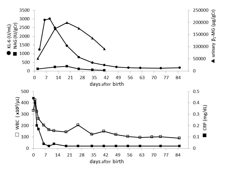 The infant’s serum KL-6 was remarkably elevated at over 3000 U/mL, which is the main factor reflecting lung tissue damage, her white blood cell count exceeded 40,000/µL, NLR was confirmed, and her u-BMG level, which is an indicator of CLD onset, also rose to 20×104 µg/gCr (Figure 3). Urinary N-acetyl-β-d glucosaminidase activity (NAG) was slightly increased and decreased to clinical reference value between 24.9 and 68.4 IU/gCr which was reported by Sakata et al. [17].