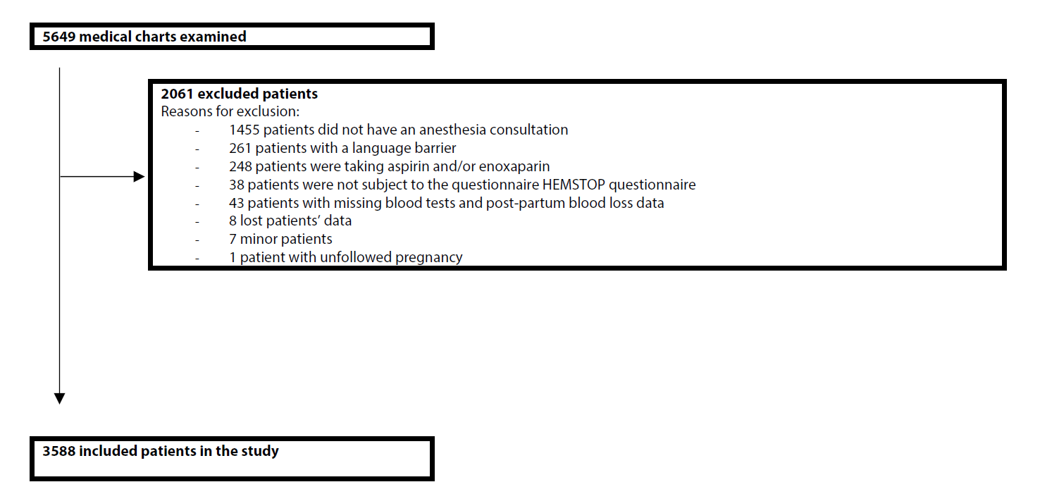 Before inclusion, each patient underwent a consultation with an anesthetist, during which the objective was to gather personal and family medical history information and identify any ongoing treatments. As part of the prepartum assessment, a HEMSTOP questionnaire was administered (Table 1 – Appendix). This questionnaire is straightforward and unambiguous, comprising seven questions, two of which are tailored specifically for women. Patients provided binary responses to the questions, assigning a score of 1 for each positive response and 0 for each negative response. The questionnaire is considered positive when the total score is equal to or greater than 2 [11].