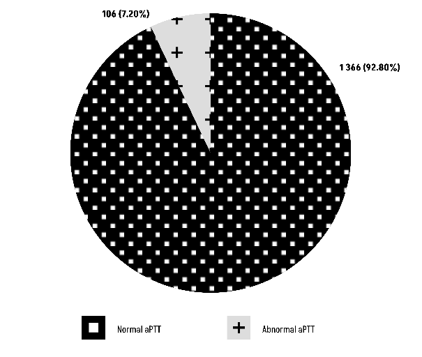 Group O versus aPTT: The Chi-square test results (χ² = 3.1888, df = 1) show a P-value of 0.07414, suggesting that there is no statistically significant relationship between blood group O and aPTT (Figure 5).