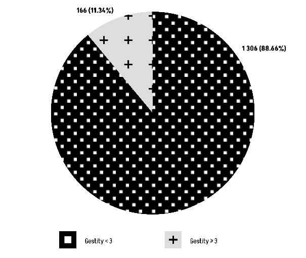 The Chi-square test results (χ² = 2,13, df = 1) show a P-value of 0.144, suggesting that there is no statistically significant relationship between blood group O and gestity (Figure 9).